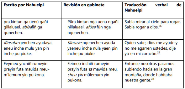 El paso de la escritura personal original a la escritura pública editada en gabinete implicó diferentes cambios en los manuscritos. En general, tal como se señalaba en la cita en la que Lehmann-Nitsche describe el método de trabajo con Nahuelpi, las versiones provistas en mapuzungun y español se mantienen sustancialmente. En línea con las diferencias indicadas más arriba, los cambios formales que detectamos afectan el sistema de transcripción y la estructura de las palabras. Además, en algunos casos, los préstamos o expresiones referidas en español se ajustan a la fonética del mapuzungun o se repone cierto elemento omitido para una mayor cohesión del texto final.25