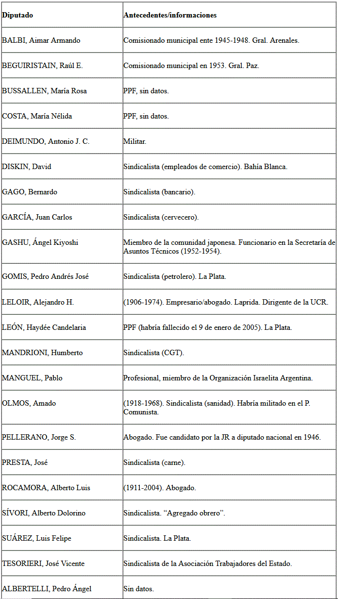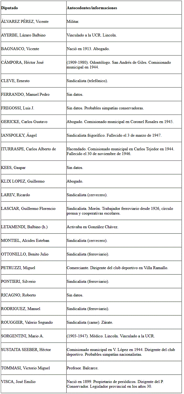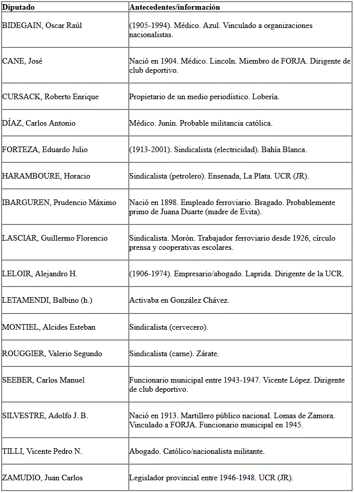 Si bien algunos de los diputados laboristas se desempeñaban en actividades o profesiones acordes con las más tradicionales para las elites políticas del país, vale remarcar que un 36% de sindicalistas en una lista de diputados nacionales constituyó un hecho inédito en la historia de la representación política argentina. Una segunda comprobación –que ya fue destacada tanto por Darío Cantón (1966) como por Félix Luna (1972)– es que ninguno de ellos había tenido actuación previa como legislador nacional. Así pues, el laborismo vehiculizó el ingreso de “hombres nuevos” a las altas cumbres de la política nacional, sin “roce” con los temas y problemas de la “alta política”. Esto es particularmente evidente en quienes provenían de las filas sindicales. Del resto de los candidatos, solo uno contaba con la experiencia de haber participado en la Legislatura bonaerense. Otros cuatro habían hecho sus primeras armas en administraciones municipales cuando fueron designados como comisionados por los interventores federales de la “Revolución de Junio” de 1943. En unos pocos casos se ha podido determinar que se trató de dirigentes políticos de rango inferior, de “comité”, especialmente radicales. Otros pocos, con simpatías o militancia nacionalista.