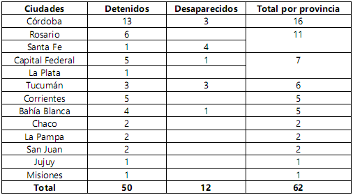 En la tapa del número 234 de Nueva Hora, del 16 de septiembre de 1976, apareció un recuadro titulado “Algunos detenidos y desaparecidos”, donde se listaban los represaliados del partido divididos por ciudades. En total contabilizaban 50 detenidos y 11 desaparecidos. En la provincia de Santa Fe, eran siete y tres respectivamente, repartidos de la siguiente manera: seis detenidos en Rosario, uno en la ciudad de Santa Fe y tres desaparecidos oriundos de esta última que luego fueron puestos a disposición del PEN.51 Al listado debemos agregar a Orlando Navarro, secuestrado unos días después de la fecha de la publicación, lo que suma un total once represaliados para la provincia. Para un análisis comparativo es interesante resaltar que Santa Fe (11) solo era superada en el número de represaliados por Córdoba (16), que por entonces tenía trece detenidos y tres desaparecidos 52 la mayoría de ellos vinculados al sindicalismo combativo.