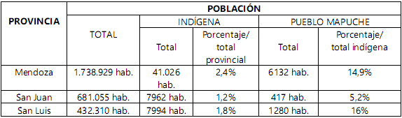 Según el Censo Nacional de Población, Hogares y Viviendas del año 2010 un dos por ciento (2%) de la población de la región de Cuyo5 se considera perteneciente a, o descendiente de, un pueblo originario. El mismo instrumento postula que los pueblos con más miembros en la región son: huarpe, mapuche y quechua; a su vez, el mayor porcentaje de grupos originarios se concentra en la provincia de Mendoza. Esta última, con un total de 1.738.929 habitantes, incluye a 41.026 personas indígenas; lo que representa más del dos por ciento (2,4%) de la población provincial. Casi la mitad de este sector (48,7%) pertenece al pueblo huarpe; el quince por ciento (14,9%) al mapuche y más del diez por ciento (10,7%) al quechua. En contra de una de las principales fórmulas culturalistas, la cual reza que las raíces y tradiciones se mantienen en el campo (Bascopé, 2009), la mayoría de los indígenas residentes en Mendoza vive en zonas urbanas y periurbanas (Instituto Nacional de Estadística y Censos –INDEC–, 2015).