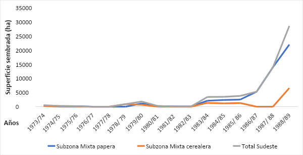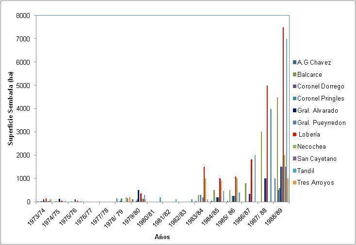 Finalmente, para la soja podemos observar que, durante los primeros años de nuestro estudio, su cultivo será marginal; incluso para la serie de años que va de 1976 a 1983, la producción es nula en la zona. A partir de la campaña 1983/1984 resurge su cultivo con 300 ha sembradas, y presenta un leve incremento campaña a campaña hasta alcanzar una superficie sembrada de 4500 ha en la campaña 1988/89.