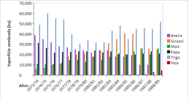 En este período se registra la pérdida de importancia e incluso la virtual desaparición del cultivo de avena, el incremento del de girasol, la constante del trigo, maíz y papa, y la aparición de la soja lentamente hacia fines de los años ochenta. Siguiendo los análisis de Martínez Dougnac (2013), se puede llegar a conclusiones similares para el sudeste bonaerense, donde el cultivo de girasol poseía mayores ventajas comparativas, factores que hicieron que este se hiciera más popular en gran parte de esta etapa y se expandiera en el marco de una creciente demanda interna de aceites comestibles en comparación con la soja. Sin embargo, si se observan las dos últimas campañas de nuestro período de análisis, la soja muestra una mayor superficie de siembra, que para 1987/88 representa el 10% del total sembrado con oleaginosas (girasol y soja), y para la última campaña examinada, 1988/89, el 15% de superficie. En el próximo apartado se abordarán las iniciativas estatales vinculadas al impulso de su cultivo a nivel nacional.