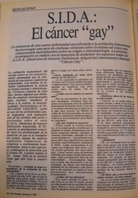 la preocupación por el SIDA, más allá de la legítima de los grupos homosexuales, aparece como un nuevo esnobismo traído… desde afuera… esta flamante preocupación de algunos medios de comunicación por una enfermedad propia de los placeres, excesos y debilidades del desarrollo muestra una vez más una frivolidad tan dependiente como ridícula. [19]