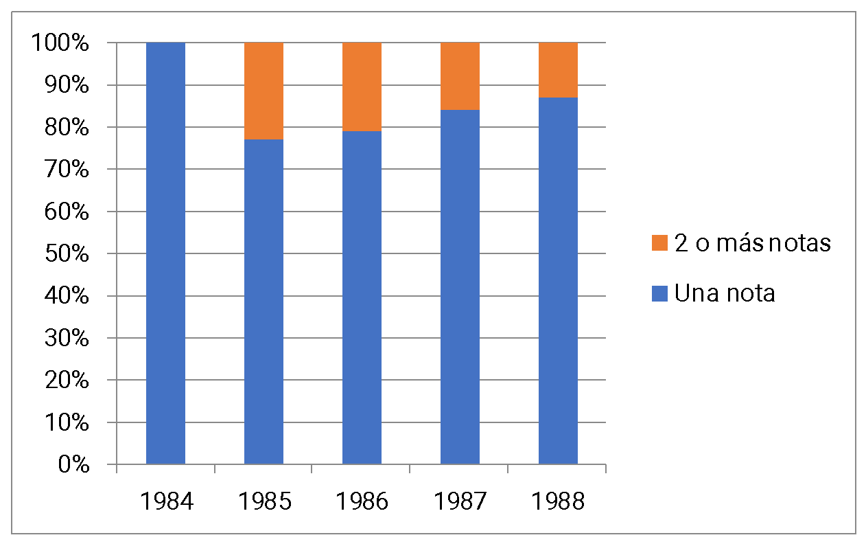 Estos datos ocultan, sin embargo, lo caótico de la información publicada. Crear categorías para organizar las notas resulta complejo, ya que en una misma noticia se incluían informaciones de distintas procedencias y relevancias, no siempre conectadas. En el cuadro 1 se muestra un intento de clasificación de las notas publicadas en Clarín entre 1984 y 1988.[3]