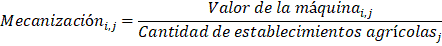 A partir de datos reportados en los censos agropecuarios de ambos países referidos al valor de maquinaria en el segmento de la siembra (arados, sembradoras) y la cosecha (segadoras, atadoras, espigadoras, trilladoras y cosechadoras), y la cantidad de establecimientos agrícolas a nivel departamental, se construyeron indicadores de mecanización agraria que permiten dar cuenta de la distribución geográfica de la maquinaria destinada a tareas agrícolas en la región.