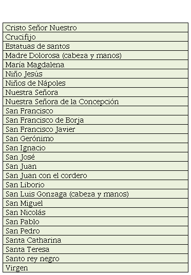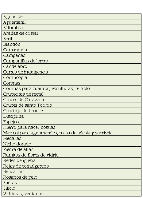 En las hojas de registro figuran, aparte de las “cajas de devociones de Roma” (que solían contener medallas, crucifijos, rosarios de materiales preciosos y relicarios), los siguientes géneros para el adorno de iglesias: