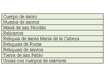 En las hojas de registro se mencionan campanillas de Loreto (Gramatke, 2019., pp. 328, 350) pero predominan las reliquias corporales de los mártires de Roma o las de contacto, como “Tierra de San Pablo” (Gramatke, 2019., p. 281). Según Ines Županov (2018) tendían un puente en el tiempo y en el espacio, entre el tiempo apostólico primitivo y la época moderna de la expansión cristiana, ahora global. Además, servían en la Compañía para una doble estrategia: velar el hecho de que la orden era relativamente reciente, y eludir la estricta y centralizada definición postridentina del martirio y la santidad (p. 19). Los inventarios de las reducciones mencionan reliquias de los correspondientes santos patronos (Brabo, 1872). En las hojas de registro se nombran además, otros elementos, como se detalla en la Tabla 2: