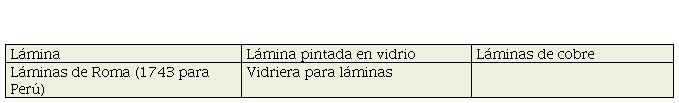 El término “lámina” se refiere mayormente a pinturas sobre cobre; el término “lámina pintada en vidrio” a pintura sobre vidrio, una técnica muy popular y con gran demanda en la Europa de entonces. Encontrar información sobre el tema representado en las láminas es aún más raro que en los lienzos. Cabe suponer que también se trata de representaciones religiosas.