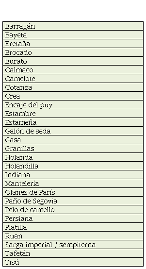 La demanda de telas europeas finas para los paramentos, ropa de las fiestas eclesiásticas, trajes de los bailarines y para vestir las esculturas era inmensa. En las hojas de registro figuraban cantidades de brocado de oro y plata, damasco, moirés, chinz, los tejidos más finos y caros de la época; así como tijeras, agujas y diferentes tipos de hilo (fino cremonés, de Córdoba y de Génova). Llama la atención las numerosas entradas de listonería, cintas y galones, que corresponden a la “ribbon mania” europea (Caracausi, 2019) y comprueban, otra vez más, la sensibilidad estética de los miembros de la orden (Gramatke, 2019., p. 227). Los tipos de tejido mencionados se pueden ver en la Tabla 6: