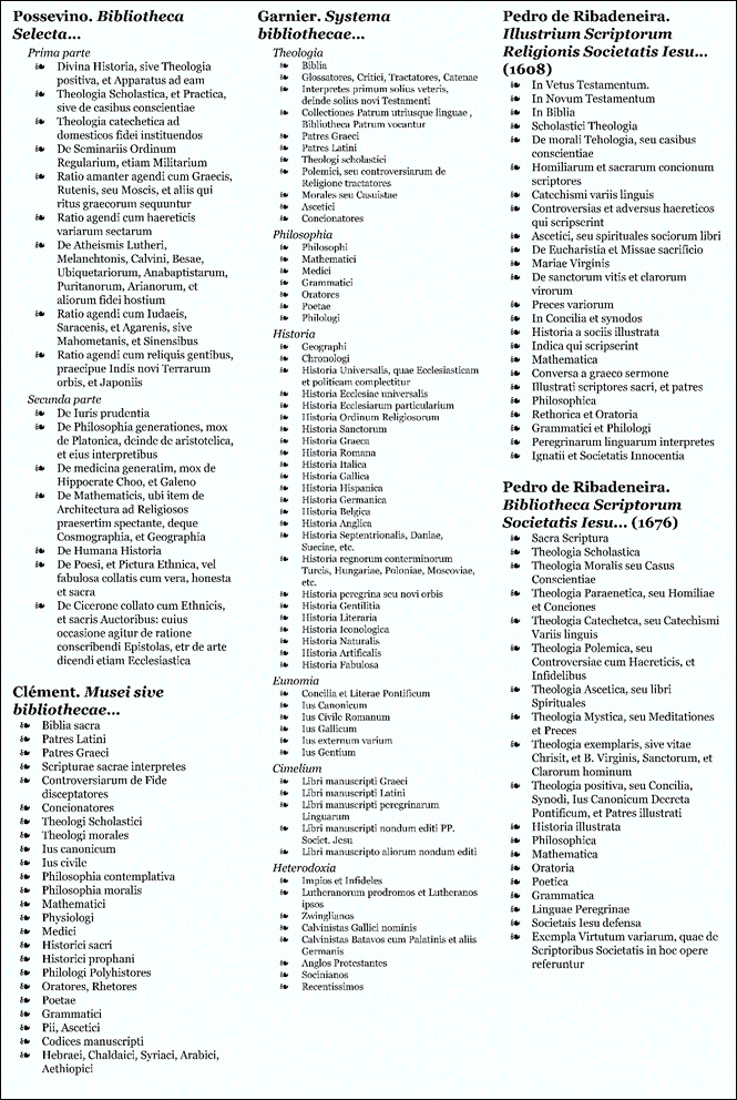 Los jesuitas, por su parte, también redactaron bibliothecas. Estas estuvieron centradas, no en la totalidad de la producción impresa, sino en su porción católica o en los escritos de la propia Compañía de Jesús (Miguel Alonso, 2003). La primera fue la Bibliotheca selecta (Roma, 1593) de Antonio Possevino, que tuvo un éxito notable y cuya influencia se extendió incluso más allá de la Compañía de Jesús (Possevino, 1593., 1593.; Biondi, 1981; Miguel Alonso, 2003; Romano, 2011). La figura de este jesuita está indisociablemente ligada a la clasificación del conocimiento. En 1573, mucho tiempo antes de publicar su bibliografía, ya se había encargado de reorganizar el archivo central de la Compañía de Jesús, para ello elaboró una clasificación por provincias que se mantiene en parte hasta el día de hoy (Friedrich, 2008). La historiografía ha sugerido que la Bibliotheca selecta debe interpretarse como una respuesta –católica y contrarreformista– a la Bibliotheca universalis de Gessner. Para Possevino, el acceso al saber debía ser cuidadosamente regulado y, sobre todo, mediado. Contra el ordenamiento alfabético de Gessner, que estimulaba la autonomía del lector, Possevino planteaba que los miembros de la Iglesia católica debían guiar a los lectores. En el libro, recomendaba ordenar los estantes físicos de las bibliotecas en siete divisiones, que avanzaban desde las Sagradas Escrituras hasta los temas genéricos: Biblia, Filosofía, Medicina, Derecho, Historia, Literatura y Generalidades. La organización que Possevino diagramó para su bibliografía impresa fue asimismo temática y descendente: en la Bibliotheca selecta, la Divina Historia aparece como la fuente primaria del saber, por lo que figura en primer lugar; luego el libro avanza hacia las regiones donde el catolicismo no estaba consolidado (al final del primer volumen, se incluyen los conocimientos sobre las regiones islámicas, Asia extremo-oriental y el Nuevo Mundo) y las disciplinas no teológicas, desde la jurisprudencia hasta la poesía (en el segundo). Entonces, el volumen inicial correspondía al conocimiento religioso y el segundo al secular.