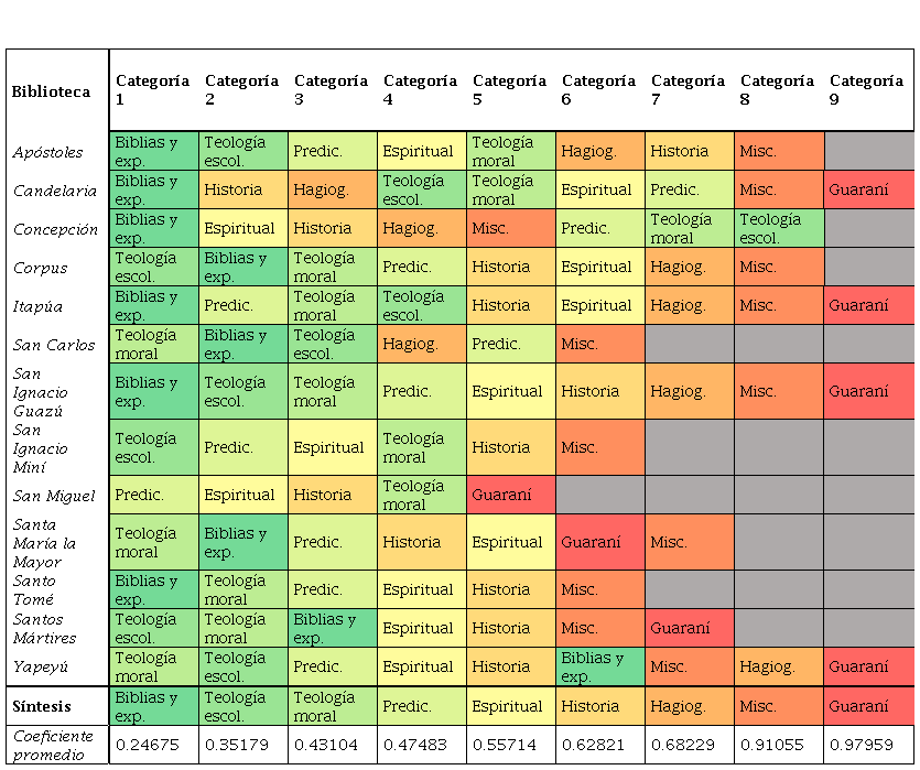 La información codificada en la Tabla 1 permite analizar cuatro cuestiones diferentes: la cercanía de la organización particular de cada biblioteca con respecto al orden contenido en la síntesis general; el tipo específico de progresión temática en este orden; la posible fuente bibliográfica de esta organización; y, por último, su carácter potencialmente eurocéntrico. Para clarificar el primer punto, decidí utilizar colores inspirados en el coeficiente, de manera que la tabla constituye también un mapa de calor que permite percibir –con un simple golpe de vista– qué tan cerca estaba la organización de cada biblioteca particular con respecto al orden del saber subyacente a todas las misiones. En este sentido, es evidente que había algunas diferencias entre las distintas bibliotecas. De las trece aquí consideradas, la única que refleja con exactitud la síntesis general es la de San Ignacio Guazú. Otras exhiben un parecido significativo: en Santos Mártires, por ejemplo, la única extrañeza respecto de la síntesis es la ubicación de Biblia y expositores en un tercer lugar; fuera de esto, las teologías figuran en los primeros puestos, Espiritual en un lugar intermedio e Historia, Miscelánea y Lengua guaraní en las últimas posiciones. La gran “librería central” de Candelaria muestra algunas diferencias con relación a dicha síntesis: los géneros históricos figuran en la segunda y tercera posiciones, mientras que Espiritual aparece antes que Predicación. No obstante, más allá de estos casos puntuales, el orden en Candelaria se corresponde con la síntesis general. Aunque varíen algunas categorías específicas, la Tabla 1 muestra que había una distribución más o menos común. Obsérvese, en particular, que Biblia y expositores aparecen en primer lugar en seis de los trece pueblos, mientras que Lengua guaraní figura en el último lugar en siete ocasiones. Es decir, la organización de la mitad de las bibliotecas comenzaba y finalizaba de la misma manera. Este orden común subyacente, expresado por cierto de manera imperfecta, sugiere que debió existir un precepto para estructurar todas las bibliotecas de un mismo modo.