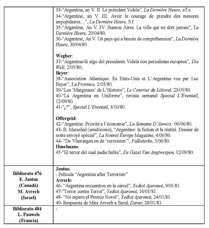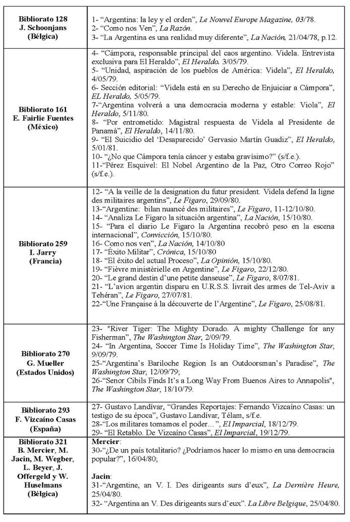 La última fase del programa contemplaba la recepción de artículos escritos por los invitados en sus idiomas nativos. Nuevamente, eran los embajadores quienes los recepcionaban y enviaban a la DGPyD, configurando así el factor de cierre de las carpetas “halladas”. Para tener en cuenta el impacto de este programa, de las siete u ocho visitas –según se incluya o no la del escritor Louis Pauwels–,[28] se generaron casi 50 artículos que fueron publicados en periódicos extranjeros y locales (tales como La Nación, La Razón, Convicción, La Opinión, entre otros).[29] Asimismo, como parte de los logros obtenidos por este programa debe considerarse la producción del documental Argentina after Terrorism realizado en 1981 como una continuación del film Argentina y el terrorismo.[30] Este conjunto de materiales da cuenta de una producción mediática considerable que desempeñó un papel significativo en la defensa y la promoción de la dictadura argentina a nivel internacional.