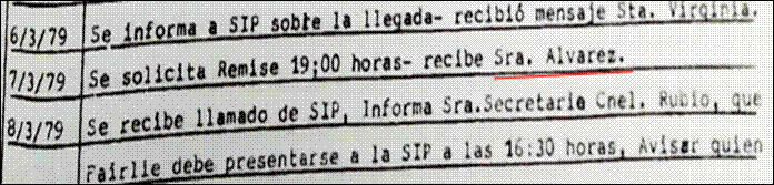 En cambio, más inesperado fue el encuentro en estas carpetas de documentos oficiales con nombres de mujeres y detalles de sus labores, que podrían pertenecer a las prisioneras trasladadas a Cancillería en situación ilegal. En el marco de los preparativos realizados por parte de empleados y funcionarios de la DGPyD ante la llegada del periodista Fairlie Fuentes (en marzo de 1979), se menciona la participación de la “Sra. Alvarez” como se puede apreciar en la imagen 2 –que tal vez fuera Marta Álvarez, detenida desde junio de 1976 en la ESMA y trasladada a Cancillería junto con otras tres mujeres desde comienzos de 1978 (Fernández Barrio, 2020)–: