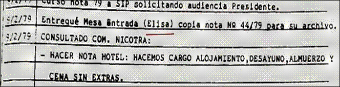 Desde una perspectiva judicial, la mera aparición de este u otros nombres incompletos en los documentos no constituye una prueba.[43] No obstante, para las investigaciones académicas el potencial de estas huellas radica en la posibilidad del entrecruzamiento con otras fuentes de información. En ese sentido, el nombre de “Elisa” (que quizás fuera Elisa Tokar detenida en la ESMA y quien también era llevada a cumplir tareas en la DGPyD) cobra una nueva impronta a la luz de los datos proporcionados por Miriam Lewin, sobreviviente de la ESMA. Ella recordó una anécdota que sugiere que Elisa Tokar podría haber desempeñado tareas en la recepción de Cancillería (“mesa de entrada”),[44] tal como se indica en el siguiente documento: