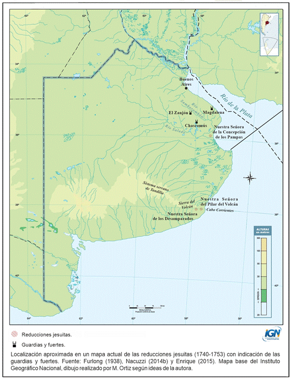 Sin embargo, creemos que es posible repensar su influencia a partir de la distinción, por un lado, de la relevancia que tuvieron en el momento en el que funcionaron y, por el otro, de las huellas posibles de rastrear luego de su desarticulación. El sitio donde funcionó la primera reducción, Concepción, en las cercanías del río Salado, ha sido localizado por algunos investigadores (Pedrotta, 2013). En el caso de Pilar y Desamparados, si bien se ignora su ubicación precisa, algunos topónimos actuales remiten a la presencia de los jesuitas, conocidos como “padres”, en la región: existe una localidad denominada “Sierra de los Padres” y, allí, una parroquia que lleva por nombre “Nuestra Señora del Pilar”. Al este de Sierra de los Padres hay una “laguna de los Padres” y, en una de sus orillas, se realizó una reconstrucción de la “Reducción Jesuítica Nuestra Señora Del Pilar” en conmemoración a la reducción jesuita. Además, la laguna está conectada con el “río de los Padres” mediante el “arroyo de los Padres”.[2]