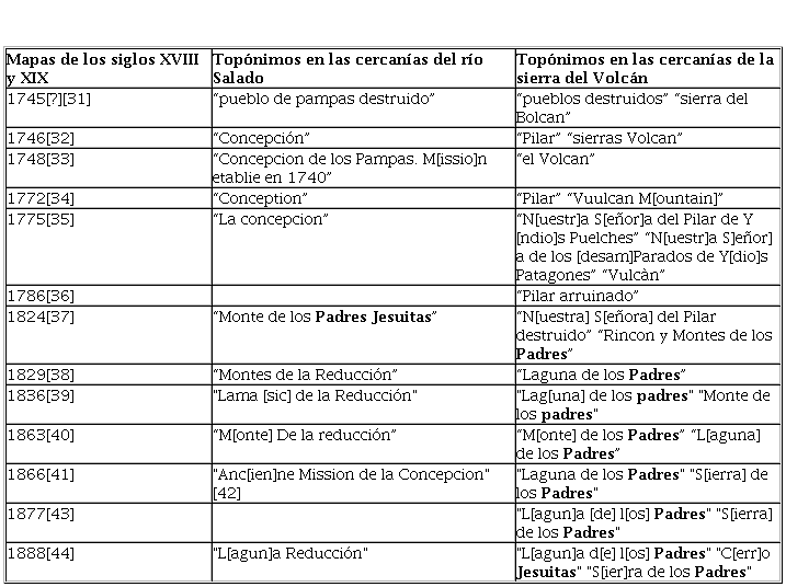 En el marco del cambio de siglo, las políticas de la Corona y los discursos oficiales en torno a los pueblos originarios pasaron de sostener procesos de segregación a fomentar la asimilación, como sucedió en los pueblos guaraníticos en las regiones del Paraguay y del Río de la Plata (Wilde, 2003). En el caso de las misiones del sur de Buenos Aires comenzado ya el siglo XIX, los jesuitas (señalados como “padres” o “padres jesuitas”) comenzaron a formar parte de las categorías utilizadas para identificar los parajes donde habían funcionado las reducciones unas décadas atrás. Es decir, una vez desarmadas dichas reducciones, la toponimia local adoptó la alusión a los misioneros que las fundaron. Por ejemplo, en los registros cartográficos del extremo sur americano elaborados por los jesuitas Cardiel [1745-1746][45] y Falkner (1774) incluyeron a “Concepción” y “Pilar”. Si bien la representación de las misiones continuó en los mapas unas décadas después, sus nombres oficiales disminuyeron mientras que las referencias a los jesuitas se volvieron más marcadas.