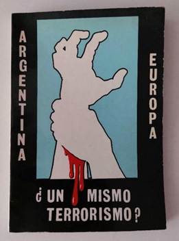 Como evidencia de esa presencia, un libro elaborado con trabajo de los secuestrados de la ESMA fue impreso en Madrid, en agosto de 1978, por la editorial española Grupo Tamayo. Argentina-Europa ¿un mismo terrorismo? buscaba influir en la interpretación extranjera sobre la situación del país latinoamericano, vinculándolo a experiencias locales.[33] Su portada, en la que la disposición del título ya establecía un paralelismo entre ambas regiones, se dramatizaba con la imagen elegida, recortada sobre un fondo celeste. La silueta de una mano en gesto de dolor aparece sujetada desde la muñeca por otra, provocando el derrame de sangre que incluso excede por debajo del límite del recuadro (véase Imagen 1). Así, la violencia expresada en esa escena conducía a la pregunta retórica que vinculaba ambos contextos bajo el paraguas de “terrorismo”.[34] Señalando como un problema compartido el enfrentar una oposición armada, el accionar del Estado argentino aparece en ese libro editado en Madrid como reacción forzada a semejante agresión.