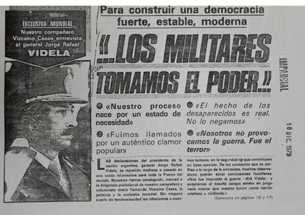 Durante su estadía, además de reunirse con el canciller y almorzar con otras figuras militares y civiles en el Jockey Club, concretó una entrevista con Videla en la residencia presidencial de Olivos. Asimismo, fue invitado a los programas televisivos de Mirtha Legrand y de Bernardo Neustadt,[53] ambos de amplia audiencia y de tendencia oficialista. De esta manera, además de expresar su opinión para el público argentino, al regresar a España publicó notas aduladoras de la situación política en el país del sur, como había sido convenido.[54] En su entrevista exclusiva al mandatario militar no se limitó a reproducir sin cuestionar el discurso oficial, legitimando claramente su accionar en las citas seleccionadas para la volanta y el copete (véase Imagen 2), sino que también describió generosamente a la persona detrás del traje civil con el que lo recibió Videla en su residencia. Refutando “una imagen lejana, poco simpática, impopular” del general, y asegurando que “conocido en persona, resulta todo lo contrario”, Vizcaíno Casas resaltó que “no ha tenido el menor inconveniente en ir contestando a mis preguntas”, “resulta de una abierta y comunicativa simpatía” y “es tan amable”. En este caso fue el presidente de facto argentino que vinculó las críticas recibidas al pasado franquista: “se dicen muchas falsedades. Ustedes, los españoles, pueden comprender mejor que nadie el impacto propagandístico de unas campañas perfectamente orquestadas, porque también las sufrieron durante años”.[55]