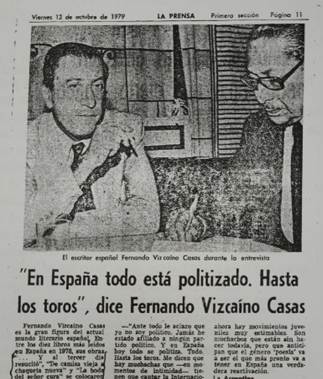 La comparación entre ambos territorios y tiempos aparece previamente en uno de los artículos motivados por su primer viaje, cuando Vizcaíno Casas elogió el modo en que era festejado el 12 de octubre en Argentina, deslizando críticas a aquel presente de su propio país.[56] En ese marco fue publicada también una nota en el diario Clarín en la que anunciaba el próximo viaje de Vizcaíno Casas retomando sus palabras: “Nuestra ciudad lo entusiasma. Tanto que promete volver dentro de un mes y medio para ‘hacer crónicas sobre vuestro país y corregir cierta visión injusta y desenfocada de la Argentina que circula interesadamente en toda Europa’”.[57] Después de aquella semana como invitado oficial, Vizcaíno Casas publicó una serie de artículos, además de la mencionada entrevista a Videla, apoyando su gobierno y desacreditando las críticas que él mismo parangonaba con las recibidas en el pasado por el franquismo. Según su parecer: “La Argentina es una muestra tremenda de la gran mentira de las propagandas orquestadas”.[58] Allí asimilaba la situación de ese país con la España de los cincuenta y afirmaba que, tras años de “convulsiones”, “hoy tienen paz, tranquilidad y desarrollo”.[59]