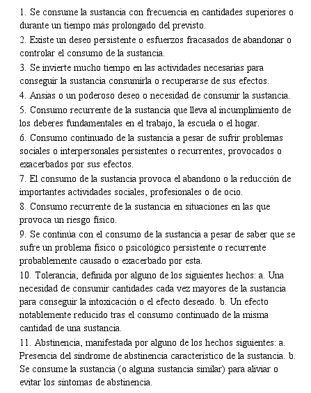 El DSM-V propone que el diagnóstico del trastorno por abuso de sustancias se hace cuando existe un patrón de consumo de alguna sustancia que provoca un deterioro o malestar clínicamente significativo y que se manifiesta en, al menos, dos de los siguientes hechos mencionados en la tabla 1 en un plazo de doce meses [44]: