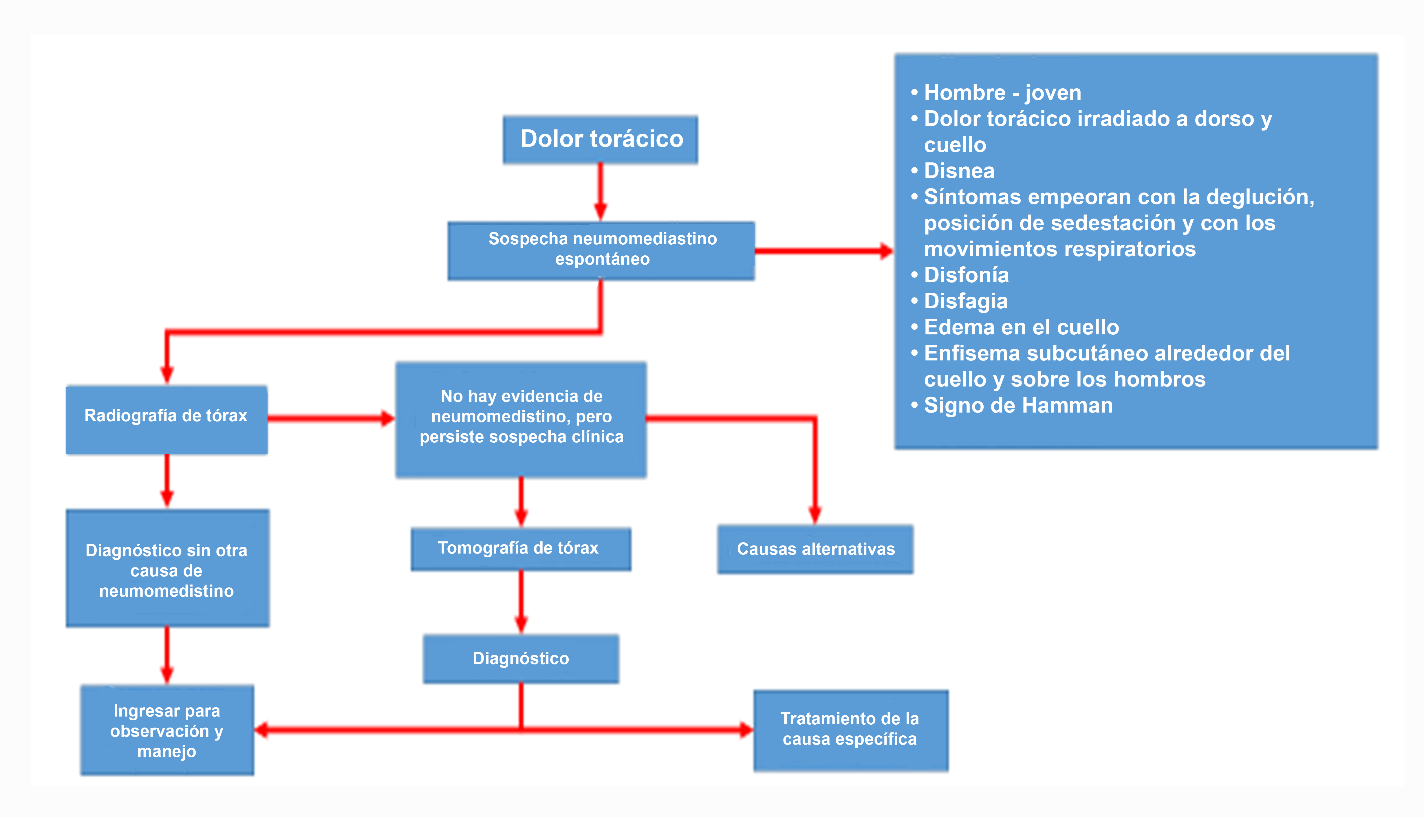 La recurrencia del neumomediastino espontáneo es excepcional, y los datos en la literatura reportan muy pocos casos, sin lograr estimar cuál fue la causa de la recurrencia y cuánto es el tiempo libre de síntomas entre los dos episodios [5, 22, 23]. En la figura 1 se presenta el algoritmo diagnóstico.