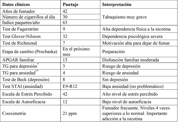 En la evaluación psicosocial se identificó un alto nivel de estrés percibido, asociado con un bajo nivel de autoeficacia, y una disfunción familiar moderada. La cooximetría reportó un nivel de 21 ppm de monóxido de carbono en el aire espirado, cifra concordante con los hallazgos encontrados en el test de Fagerström (alta dependencia física a la nicotina). Los resultados encontrados en la evaluación clínica interdisciplinaria se pueden ver en la tabla 1.