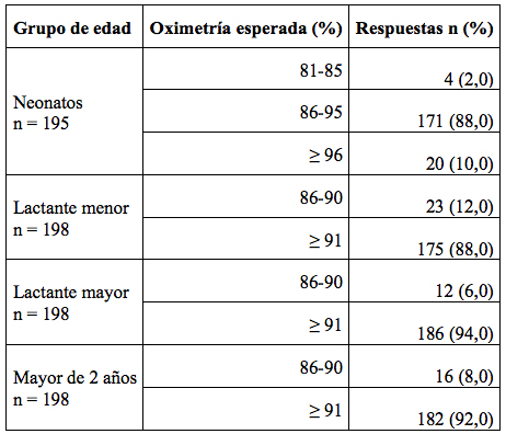 Existen algunos estudios clínicos con buen tamaño de muestra que evalúan los valores de saturación normal en niños sanos a diferentes alturas sobre el nivel del mar, de acuerdo con el estado de conciencia. En el anexo 2 se resumen los valores de saturación encontrados en estudios realizados a diferentes metros sobre el nivel del mar, de acuerdo con el grupo de edad hasta los 5 años (3,17,18,19,20,21).