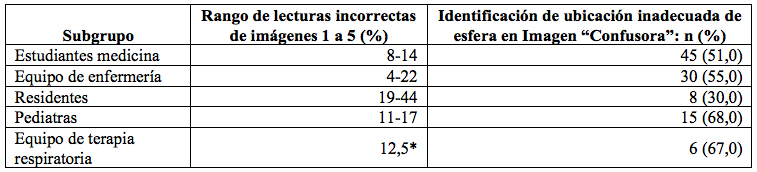 En referencia a las lecturas de las imágenes de flujómetros, se excluyó la última imagen por presentar resultados extremos, que no concordaban con el resto de imágenes. El rango de respuestas incorrectas varió entre el 9 % y 19 %, en promedio general (tabla 2). Por subgrupos, los estudiantes fueron quienes tuvieron menor rango de frecuencia de lecturas incorrectas (8 % al 14 %); mientras que los residentes de Pediatría tuvieron mayor rango de respuestas incorrectas (19 % a 44 %). Al evaluar las respuestas del grupo de terapia respiratoria, se encontró un encuestado equivocado en 3 de las 6 imágenes mostradas y un neonatólogo (n = 4) respondió incorrectamente en una ocasión. Los subgrupos que identificaron con mayor frecuencia la ubicación inadecuada de la esfera en la imagen “confusora” fueron los pediatras (68 % de un grupo de 22 personas) y el equipo de terapia respiratoria (67 % de un grupo de 9 personas) (tabla 5).