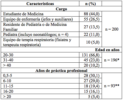 La tasa de recolección fue del 77 % (200 participantes voluntarios de 259 potenciales participantes). La mayoría de la población encuestada correspondió a estudiantes de medicina; el 67 % de los participantes tenía entre 20 y 30 años, y el 70 % de quienes no eran estudiantes tenía 6 años o más de práctica profesional. Mayor información sobre características generales de los participantes se encuentra en la tabla 1.