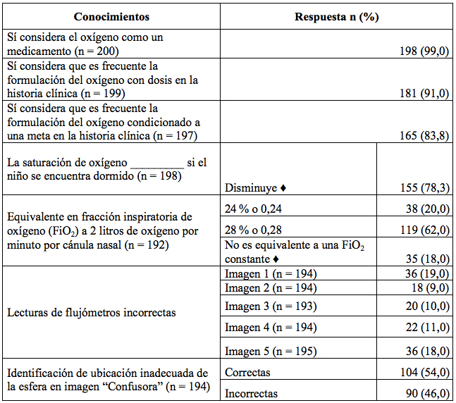 Este estudio representa un panorama general sobre conocimientos de oxigenoterapia en el personal de salud que usualmente administra este medicamento. Un porcentaje considerable de los encuestados tuvo errores en relación con la saturación según el estado de vigilia (22 %) y la lectura de flujómetros (hasta un 19 % fueron incorrectas); además, casi una cuarta parte de los encuestados no conoce complicaciones sobre el uso prolongado de O2. Una tercera parte desconoce efectos adversos cuando se administra FiO2 mayor a la necesaria y un 10 % de los encuestados tiene errores sobre metas de saturación para población neonatal. Esto permite hacer hincapié en la necesidad de profundizar en este tema, de hacer campañas educativas periódicas y de recomendar llevar a cabo estudios similares en las diferentes instituciones del país para garantizar la unificación de criterios y conocimientos en las unidades pediátricas.