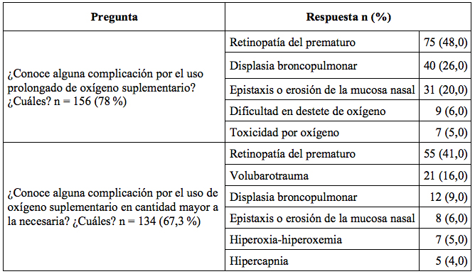 El 99 % de los participantes consideró el O2 como un medicamento, el 91 % indicó que es frecuente la formulación de O2 con dosis en la historia clínica y el 84 % contestó que es regular que se formule la meta de SpO2 en la historia clínica. El 22 % de los encuestados respondió que la SpO2 aumenta o se mantiene igual cuando el niño se encuentra dormido (tabla 2). En cuanto a los efectos adversos por oxigenoterapia, el 78 % respondió que conocía al menos una complicación por uso prolongado de oxígeno y el 67 % conocía al menos una complicación por uso de mayores cantidades de oxígeno a las necesarias. Las complicaciones más frecuentemente mencionadas se muestran en la tabla 3.