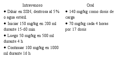 Las decisiones terapéuticas se basan, por supuesto, en los hallazgos de la evaluación clínica y paraclínica del paciente. Se recomienda iniciar el esquema de manejo asumiendo una intoxicación en pacientes que presenten niveles de acetaminofén en sangre superiores a 200 µg/ml 4 h después de la ingesta o en aquellos que presenten elevación de las transaminasas con antecedente de ingesta de acetaminofén a dosis superiores a los 6 g en un día (50). La acetilcisteína se considera el antídoto y manejo de elección en pacientes con IA. En general, el manejo aceptado supone su administración en bolo a razón de 150 mg/kg diluidos en 100 a 200 ml de dextrosa al 5 %, posterior infusión de 50 mg/kg en 0,5 l de solución salina o dextrosa al 5 % en las siguientes 4 h y luego 100 mg/kg en 1 l de solución salina o dextrosa al 5 % (tabla 1) (21).