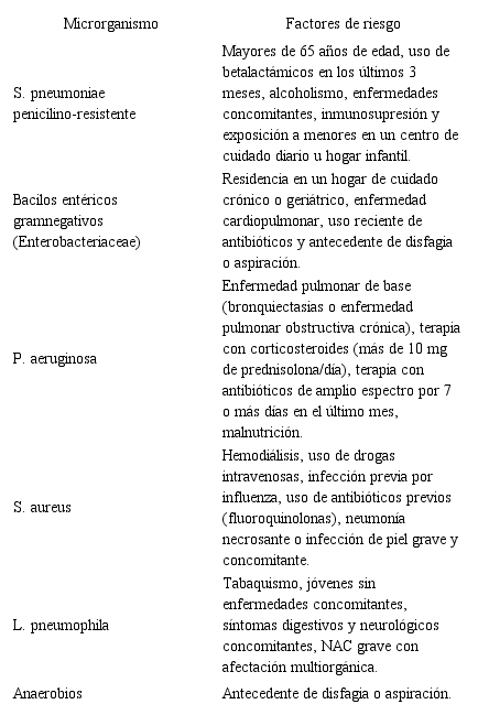 En los estudios con mejores métodos diagnósticos y de recolección se ha logrado identificar el germen causal solo en el 40-60 % de los casos, en los cuales el más frecuente es Streptococcus pneumoniae, en un 20-60 %; seguido por Haemophilus influenzae (3-10 %); Staphylococcus aureus, bacilos entéricos gramnegativos, Mycoplasma pneumoniae, Clamydophila pneumoniae, Legionella pneumophila y virus respiratorios (7,8,9). Existen ciertos factores de riesgo y condiciones que incrementan la probabilidad de infección con algunos microrganismos específicos, mencionados en la tabla 1.