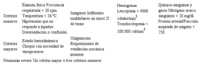Aproximadamente, el 10 % de los pacientes con NAC desarrollará una neumonía severa, la cual en la mayoría de los casos requerirá manejo en la UCI, debido a la presencia de choque con necesidad de vasopresores o de insuficiencia respiratoria, que necesita ventilación mecánica. Los pacientes con mayor riesgo de presentar una NAC severa son aquellos con edad avanzada, presencia de comorbilidades, residencia en hogar geriátrico, inmunosupresión o alteración del estado mental. Detectar a estos pacientes es esencial, porque son ellos los que tienen una tasa de mortalidad más alta y requieren una atención con más apoyo. Sin embargo, se reitera que aproximadamente un tercio de los pacientes con neumonía severa eran previamente sanos (2). Para la clasificación de neumonía severa existen una serie de criterios establecidos por la Sociedad de Enfermedades Infecciosas de América y la Sociedad Torácica Americana, en 2007, los cuales permiten priorizar el manejo en la UCI o en una unidad de cuidados intermedios (5). Estos se pueden ver detalladamente en la tabla 2 (5).