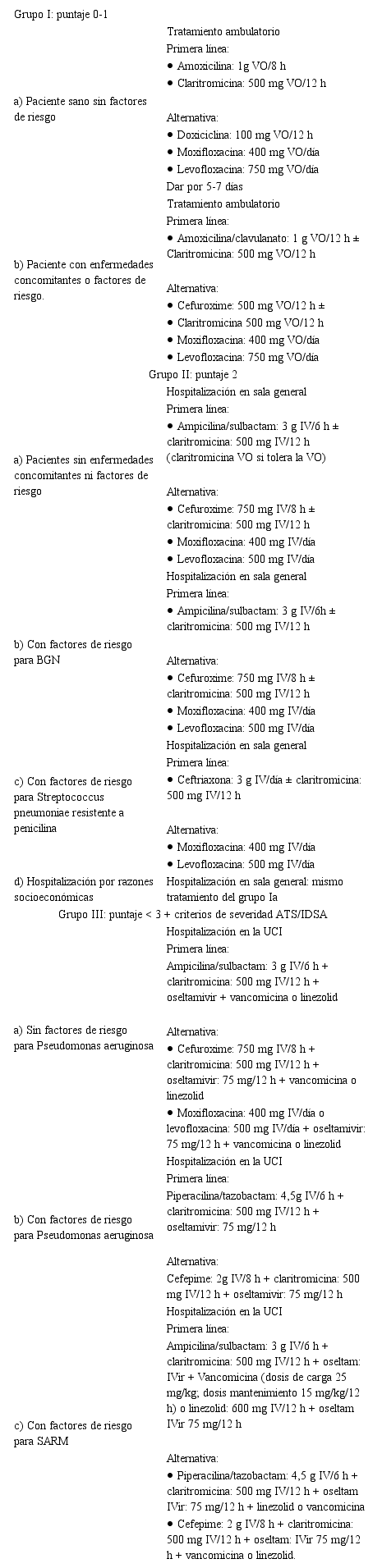 Manejo empírico según los grupos del CURB-65 y criterios de severidad la Sociedad de Enfermedades Infecciosas de América y la Sociedad Torácica Americana (esquema de manejo en la tabla 3) (5). Deben iniciar en la primera hora en pacientes con sepsis o choque séptico; en los demás, en las primeras 4-6 h (1,5).