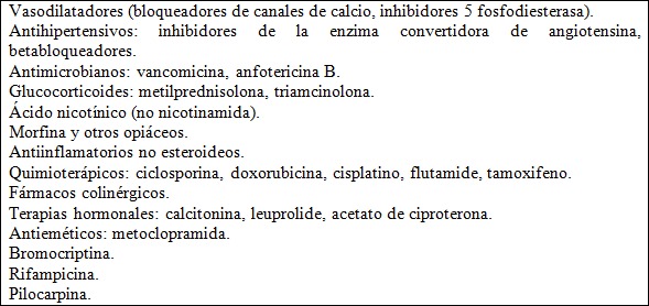 Es secundario a un metabolismo ausente o deficiente de acetaldehído deshidrogenasa, un metabolito hepático del alcohol etílico. La acumulación de acetaldehído da como resultado la degranulación de los mastocitos, liberación de histamina y síntomas de rubor facial, taquicardia y náuseas después de la ingesta de alcohol (26). Es frecuente en raza asiática y raro en otros grupos raciales (8). Puede ser potenciado por el uso concomitante de fármacos como griseofulvina, metronidazol, tacrolimus tópico, clorpropamida, o exacerbar la aparición de rubor facial en condiciones como rosácea, tumores carcinoides, mastocitosis, linfoma tipo Hodking y estados hipereosinofílicos (8). Eminentemente, el diagnóstico es clínico, y se confirma, en contextos de estudios de investigación, con el uso de parches de alcohol deshidrogenasa tras la ingesta de alcohol con la subsecuente mejoría de los episodios de rubor facial (8). En la tabla 5 se listan los medicamentos relacionados con rubor facial.