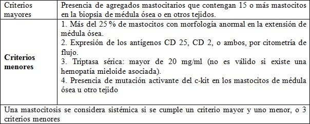 La mastocitosis es una proliferación neoplásica clonal de los mastocitos que puede afectar muchos órganos (38). Se considera una enfermedad sistémica cuya presentación clínica puede incluir episodios de rubor facial secundarios a la activación mastocitaria, acompañados de taquicardia, hipotensión, síntomas digestivos, etc. Es más frecuente en la edad pediátrica (dos tercios de los casos) que en la adulta (39). La Organización Mundial de la Salud establece los criterios diagnósticos indicados en la tabla 6 (40,41).