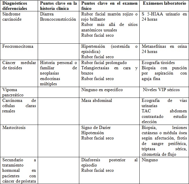 El diagnóstico diferencial del rubor facial transitorio es extenso, y engloba tanto procesos benignos como malignos. Ello implica que no es posible realizar un algoritmo diagnóstico que aplique a todos los pacientes; tampoco es recomendable una batería inicial de pruebas diagnósticas para todos ellos. Por tanto, la clave es realizar una historia clínica completa con la cual tener una sospecha fundamentada para solicitar las pruebas diagnósticas más pertinentes de manera individualizada (5,7). Se sugiere tener en cuenta los siguientes aspectos: