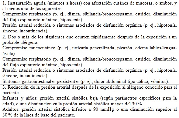 La anafilaxia es una reacción de hipersensibilidad generalizada que amenaza la vida, en la que ocurre una liberación de mediadores de basófilos y mastocitos con síntomas y signos a diferentes niveles, entre los cuales se incluye el rubor facial transitorio que es asociado a edema de las conjuntivas y la mucosa oral. El diagnóstico de anafilaxia es muy probable cuando se cumple cualquiera de los tres criterios (tabla 4) (25).