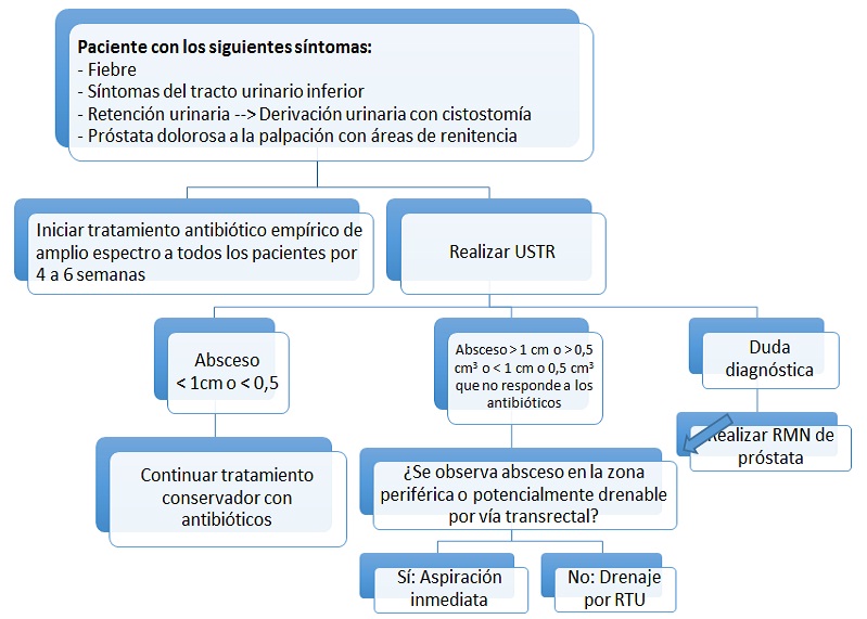 Abstract: Introduction and objectives: Prostatic abscess is defined as the presence of one or more collections of purulent accumulations in the prostate. Its diagnosis and management have been controversial, given the absence of clinical practice guidelines that allow a standardized approach. Objective: The purpose of this article is to suggest a diagnostic and therapeutic algorithm based on the review of non-systematic literature on physiopathology, etiology, risk factors, diagnosis and treatment of prostate abscesses. Materials and methods: We reviewed Medline with MeSH terms: "prostate", "abscess", and free terms: "prostatic abscess", obtaining 71 review articles. From these, we selected the 19 articles written in English that best correlated with the search topic. We did a critical review of these, to finally suggest a diagnostic and therapeutic algorithm. Results: Of the 19 selected articles, we found only 1 randomised clinical trial, 7 observational retrospective cohort studies, 3 non-systematic review articles, 6 case reports, 2 case series and no clinical practice guidelines. Conclusions: Standardized clinical practice guidelines for the management of prostate abscesses do not yet exist. The diagnostic method of choice is transrectal ultrasonography (USTR) of the prostate. Treatment depends on the size and location of the abscess. For abscesses < 1 cm or < 0.5 cm3 cc, conservative treatment is suggested. For abscesses larger than this, USTR-guided aspiration is suggested if located in the peripheral zone, and transurethral resection (TUR) of the abscess if located in the central, transitional, or anterior zone.