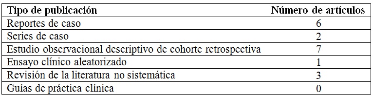 De los 71 artículos arrojados por la búsqueda, seleccionamos los 19 artículos que más se correlacionaban con nuestro tema. De estos 19 artículos, encontramos un ensayo clínico aleatorizado, 7 estudios observacionales de cohorte retrospectiva, 3 artículos de revisión no sistemática, 6 reportes de caso, 2 series de caso y ninguna guía de práctica clínica (tabla 1).