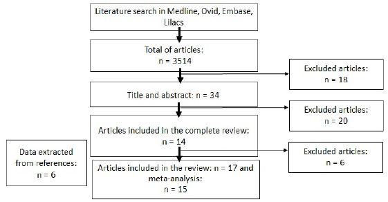 In the initial search, 3514 articles were identified, 17 of which were selected for the systematic review, 6 articles were chosen with the “snowball” strategy based on the references of different articles of the initial search; 12 corresponded to cases and controls and the others to cohort studies. Of the 17 reviewed, 15 were chosen to perform the meta-analysis. Two of them did not provide data to obtain the sensitivity and specificity of a score ≥ 3 in the Sgarbossa criteria ( Figure 1).