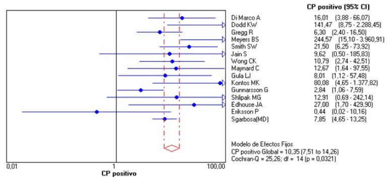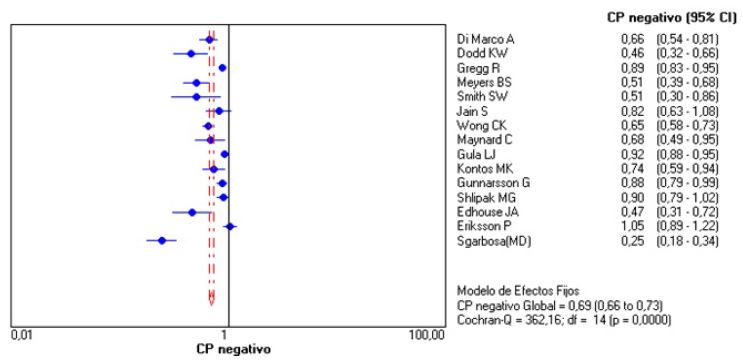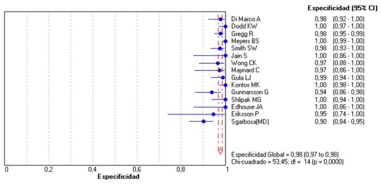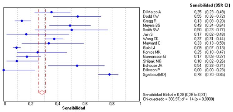 Resultados: Catorce estudios evaluaron los criterios de Sgarbossa utilizando un puntaje mayor o igual a 3 como corte. En total, fueron 3689 pacientes. La sensibilidad fue de 0,27 (IC 95%: 0,24-0,29; p = 0,0000); especificidad de 0,97 (IC 95%: 0,96-0,98; p = 0,0001) LR(+) de 10,95 (6,28-19,11; p = 0,03) y LR(–) de 0,67 (0,56-0,81; p = 0,0000).