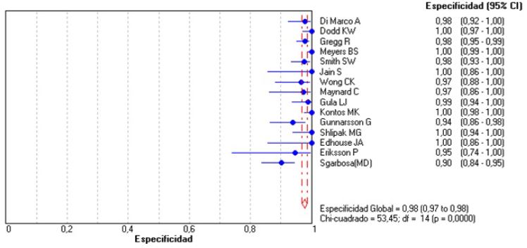 In 6 articles ( 4, 5, 6, 7, 8, 9) the LR+ could not be determined, given that its specificity was 100%; 50% of these articles did not exceed 100 patients, and only one exceeded 500 patients ( 5), and in the latter only 36 patients had AMI + LBBB. The small number of patients made our meta-analysis difficult. Despite this, the results are similar regardless of the sample size, as can be seen in Table 3, and in Figures 2 and 3, corresponding to sensitivity and specificity; a score ≥ 3 has a very low sensitivity and excellent specificity in all articles of the meta-analysis.