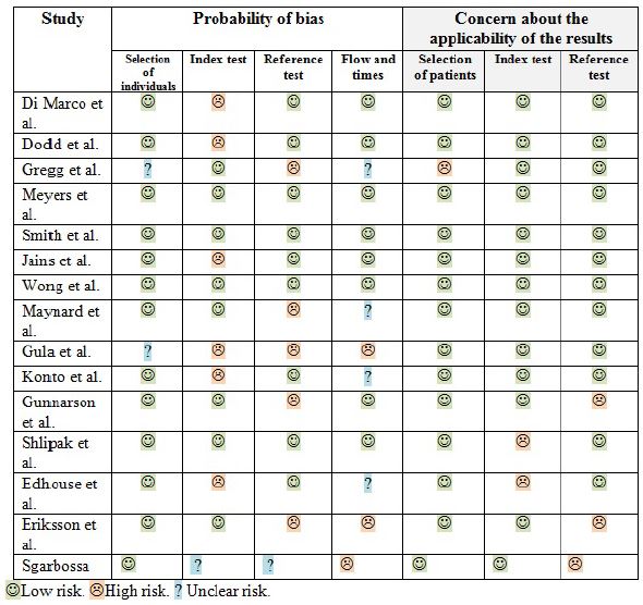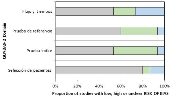 Through this tool, we evaluated two fundamental aspects: the proportion of concern generated by the applicability of the primary studies used for the systematic review, and the proportion of concern generated by the primary studies regarding the risk of bias; this by means of evaluating the flow and times, reference test, index test and patient selection.