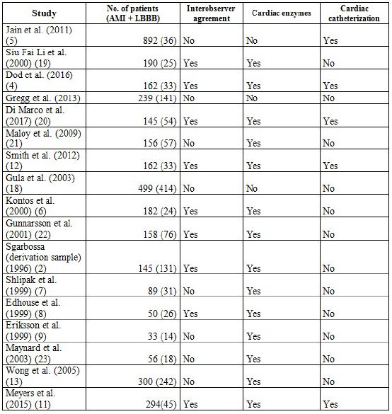 The concomitant presence of left bundle branch block (LBB) and suspicion of acute myocardial infarction (AMI) is a diagnostic and therapeutic challenge for the physician ( 1). For this reason, the Sgarbossa criteria facilitate the management of these patients ( Table 1) ( 2). However, despite having a good specificity, in the original study published in 1996, the sensitivity barely reached 36% ( 2). This means that a large percentage of patients could be excluded from reperfusion therapies because they do not have an AMI diagnosis if these criteria are not interpreted adequately. We carried out a systematic review and meta-analysis, in order to determine if the Sgarbossa criteria perform well for the diagnosis of AMI in patients with LBBB.