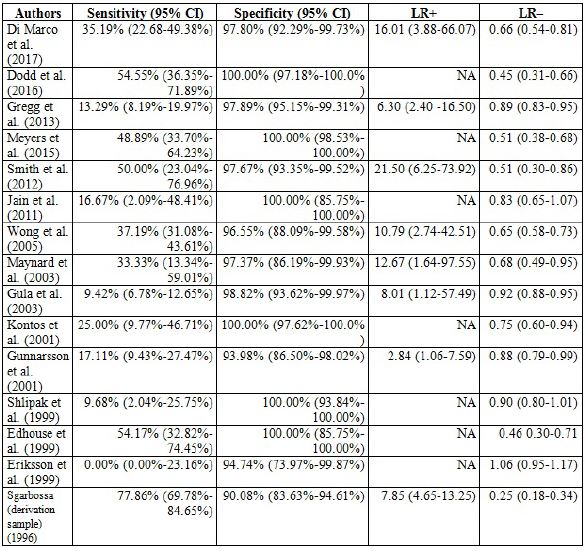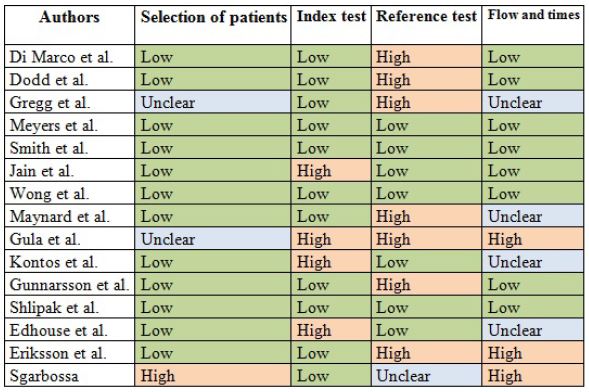 Method: Structured literature search in Medline, Lilacs, Ovid, and Embase from January 1996 to January 2018. Using the inclusion and exclusion criteria 3 reviewers selected the articles that answered the research question. The quality of the articles was evaluated using the QUADAS-2 tool.