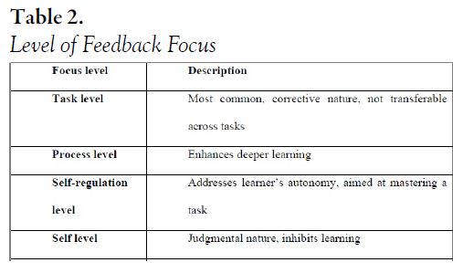 Hattie and Timperley maintain that the level at which feedback is aimed determines the effectiveness of the strategy (17).