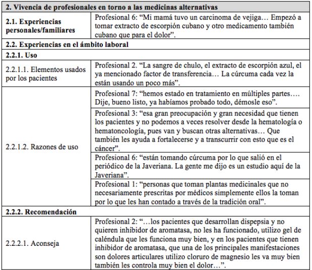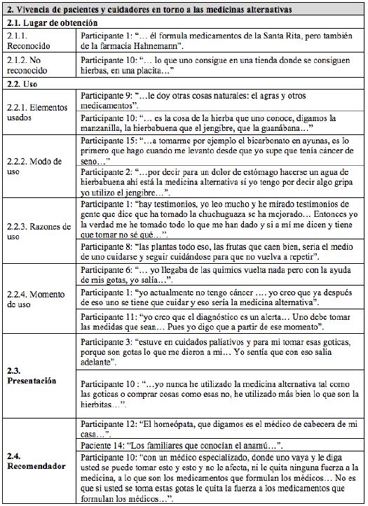 El uso es el segundo aspecto de interés. Para pacientes y cuidadores hay características relacionadas con la forma en que se utilizan ciertos elementos de las MAC, que permiten describir matices de las vivencias que han tenido. Esta visión es percibida igualmente por los profesionales en la aproximación que hacen a su vivencia desde lo relatado por los pacientes. Al respecto, el uso de productos de consumo regular como las frutas se consideran en ciertas circunstancias un elemento de MAC ( tabla 1: 2.2.1). En otros casos, el efecto positivo está referido no solo al elemento, sino a la forma en que se utiliza (p. ej., en ayunas) y a la indicación específica (p. ej. dolor de estómago vs. gripa) ( tabla 1: 2.2). Aparecen también las razones de uso que incluyen el cuidado de la salud en general (bienestar físico y emocional), la búsqueda de alternativas diferentes a la medicina alopática, la percepción de efectividad para el manejo de circunstancias específicas (dolor, depresión y ansiedad), y la posibilidad de cura o control de la enfermedad como herramienta complementaria al manejo oncológico ( tabla 1: 2.2.3; tabla 2: 2.2.1). Finalmente, se identifica como elemento de la vivencia el uso de MAC en relación con el momento de evolución de la enfermedad; así, para la mayoría de participantes el diagnóstico desencadena el uso de MAC y son usadas durante toda la evolución de la enfermedad, pero para otros varía según situaciones particulares, por ejemplo, paralelo a la quimioterapia para reducir efectos secundarios o, por el contrario, solo al finalizar el tratamiento como parte del cuidado de la salud o con la intención de no interferir con el tratamiento oncológico ( tabla 1: 2.2.4).