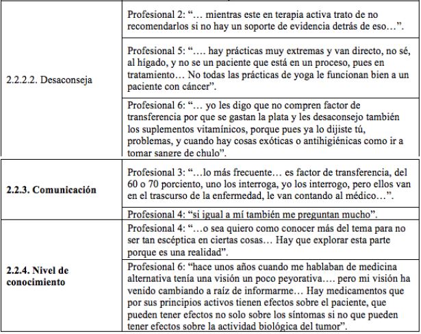 Para finalizar este segmento, se incluye la subcategoría de nivel de conocimiento, que surge desde las afirmaciones de algunos profesionales. Esta alude a la identificación de una necesidad de información y conocimiento por parte de los profesionales sobre las MAC, lo que asocian con la posibilidad de un mejor ejercicio profesional frente a la realidad del paciente que frecuentemente acude al uso de las MAC. También se hace evidente el cambio de perspectiva de algunos profesionales frente a MAC tras un mayor conocimiento, ellos transitan de una opinión despectiva hasta una perspectiva de reconocimiento de la efectividad en algunas prácticas que aportan evidencia científica.